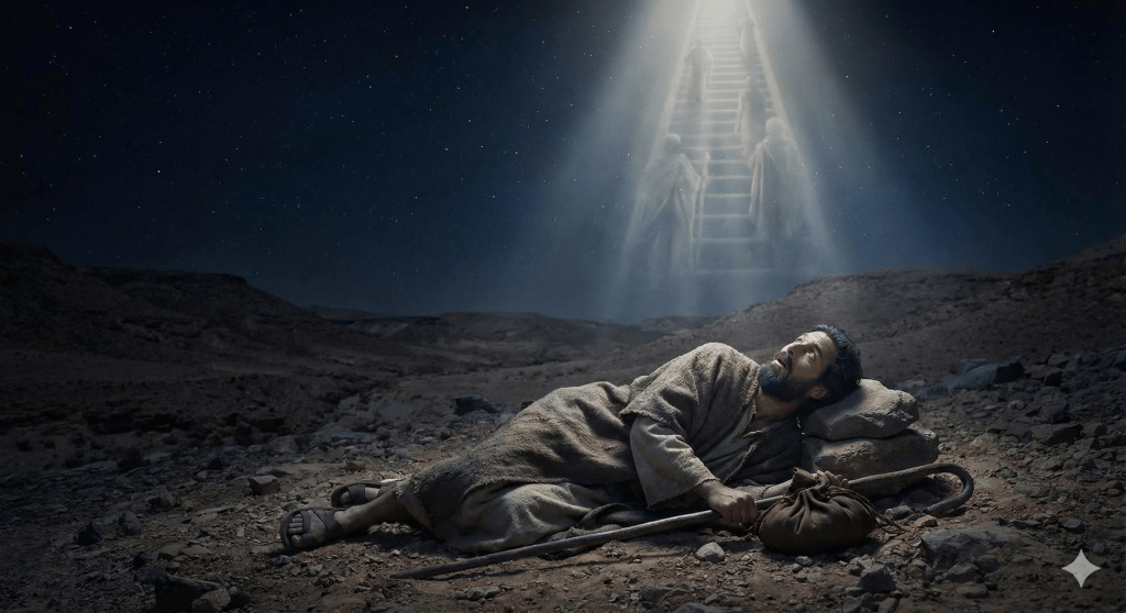 El sueño de la escalera no describe el esfuerzo humano por llegar al cielo, sino la acción soberana de Dios descendiendo para comunicarse con el hombre. Ángeles suben y bajan, indicando que el cielo no está cerrado, y que Dios gobierna la historia desde su trono. Más adelante, Jesús retomará esta imagen para declarar que Él mismo es el verdadero vínculo entre el cielo y la tierra (Jn 1:51).