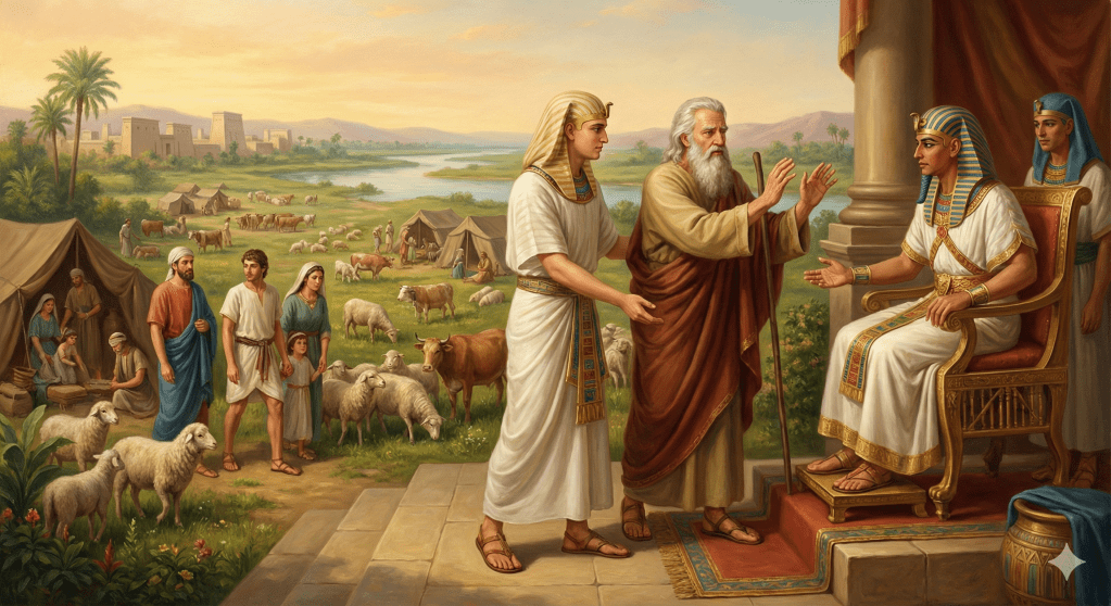 Uno de los momentos más significativos del capítulo ocurre cuando Jacob bendice al faraón. El texto afirma que el menor bendice al mayor, revelando un principio espiritual profundo: la bendición no depende del poder político, sino del favor de Dios (Heb 7:7). Aunque Jacob es un anciano extranjero, porta la promesa del Dios verdadero.