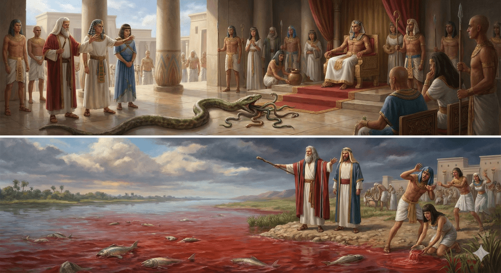 El primer juicio —el agua convertida en sangre— confronta directamente una de las fuentes de vida de Egipto. El Nilo, venerado como deidad, queda expuesto como impotente. Este acto revela que Dios juzga los falsos dioses y demuestra que solo Él es fuente de vida (Jer 10:10).