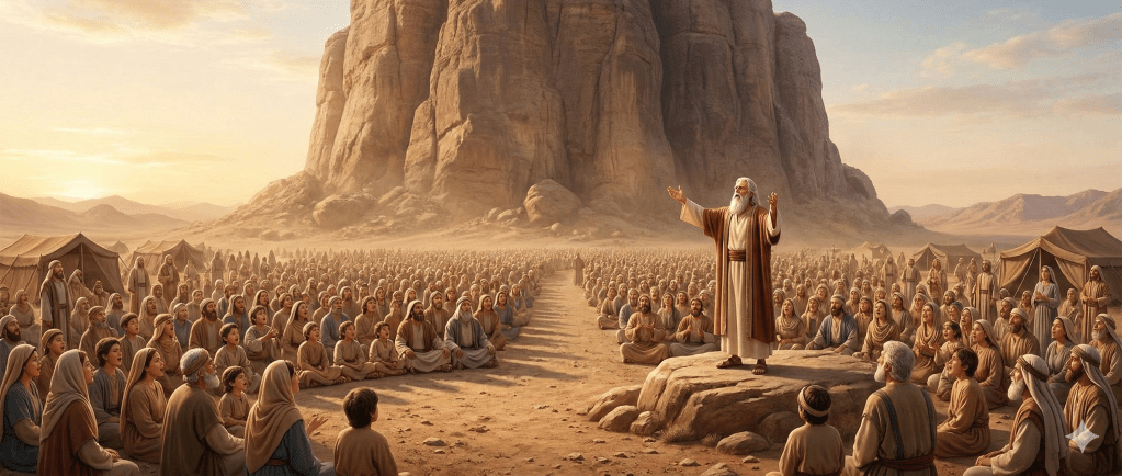 Israel continúa en las llanuras de Moab, al oriente del Jordán, frente a la tierra prometida. Después de renovar el pacto y preparar al pueblo para el cambio de liderazgo, Moisés pronuncia sus últimas palabras. Los capítulos finales de Deuteronomio reúnen tres momentos profundamente solemnes: el canto que resume la historia espiritual de Israel, la bendición profética sobre las tribus y la muerte de Moisés.
