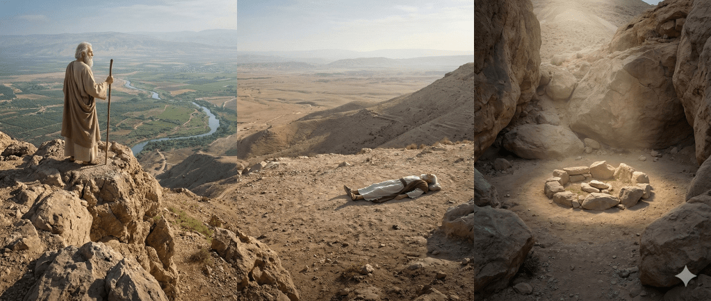 El capítulo final describe uno de los momentos más conmovedores de toda la Biblia. Dios lleva a Moisés al monte Nebo y le muestra la tierra prometida. Desde allí puede contemplar la herencia hacia la cual guió al pueblo durante décadas (Dt 34:1–4).