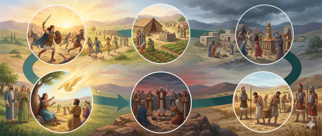 A partir de aquí se presenta el ciclo que se repetirá muchas veces: el pueblo se aparta y sirve a otros dioses, Dios permite que enemigos lo opriman, el pueblo clama, y el Señor levanta un juez para librarlo (Jue 2:16–19). Este proceso muestra que la disciplina divina no tenía como propósito destruir a Israel, sino corregirlo. La paciencia de Dios se ve en que, aun cuando el pueblo vuelve a caer, Él sigue levantando libertadores para preservar la nación y mantener viva la promesa hecha a Abraham.