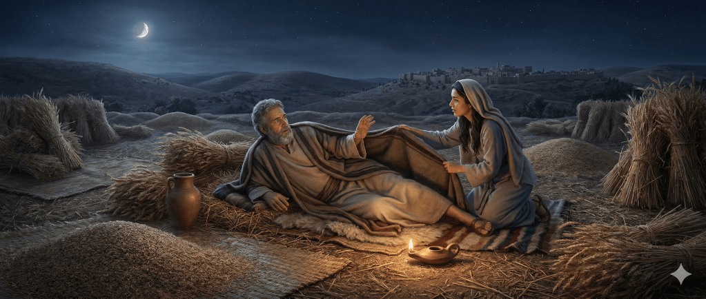 Rut 3 presenta una escena clave en el desarrollo del relato. Noemí instruye a Rut para que se acerque a Booz como posible redentor. En la cultura israelita, el pariente cercano (goel) tenía la responsabilidad de preservar la familia, redimir propiedades y levantar descendencia (Lv 25:25; Dt 25:5–10).